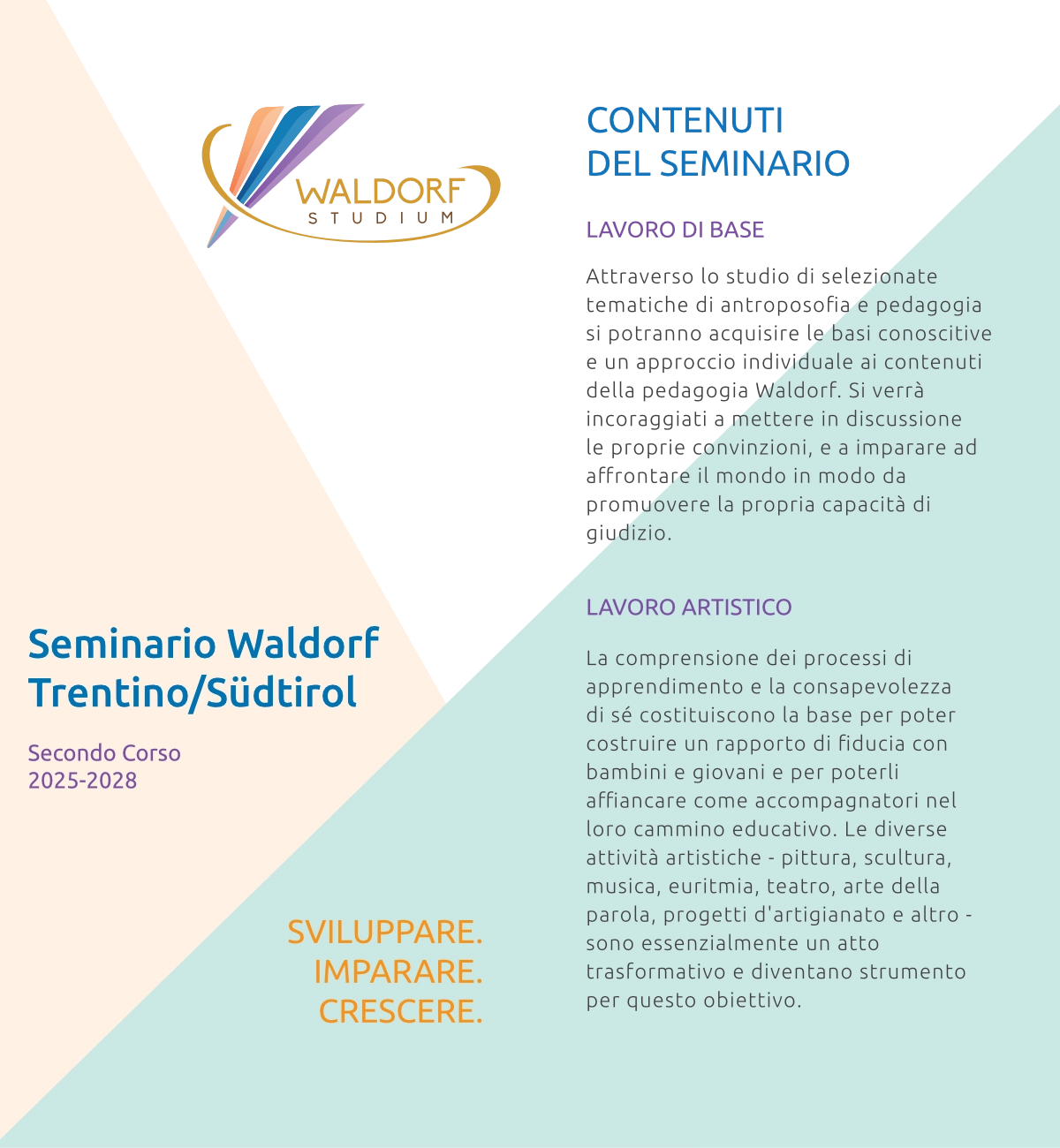 Attraverso lo studio di selezionate tematiche di antroposofia e pedagogia si potranno acquisire le basi conoscitive e un approccio individuale ai contenuti della pedagogia Waldorf. Si verrà incoraggiati a mettere in discussione le proprie convinzioni, e a imparare ad affrontare il mondo in modo da promuovere la propria capacità di giudizio.